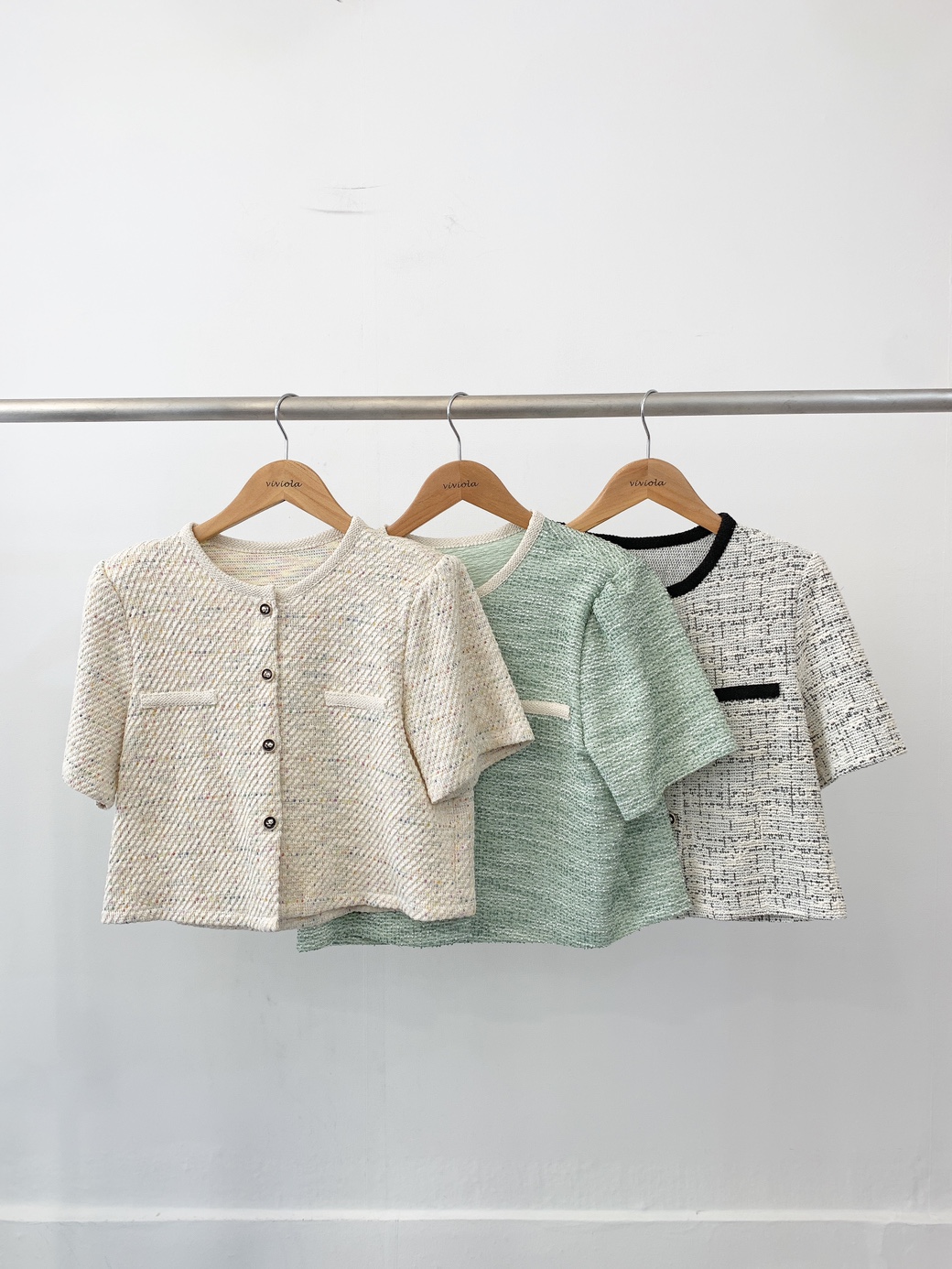 푸른 여름 하객룩 노카라 반팔 트위드 자켓 가디건