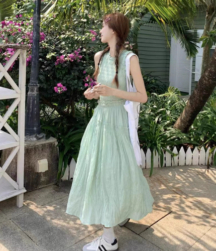 [♥당일발송]민트 그린 스모크 민소매 백리본 프릴 플리츠 나시 리조트룩 레이스 프릴 캉캉 휴양지룩 셀프웨딩 여리 동남아 드레스 롱 원피스 시스루 여행룩 231094-74