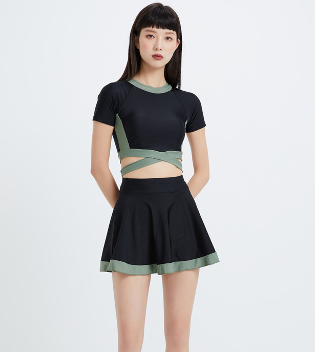 슬림 라운드 크로스 리본 스트랩 투톤 크롭 상의+비치웨어 워터파크 하늘하늘 플레어 투피스 래쉬가드 수영복
