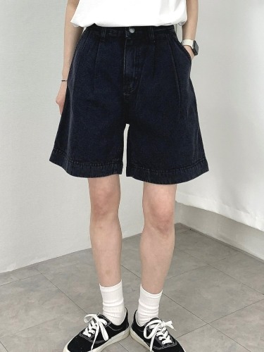 061 여성 5부 핀턱 흑청 반바지 버뮤다 팬츠 검정 4부