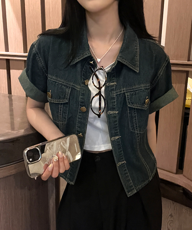 [당일출고🍂자켓]데님 세미크롭 반팔 청자켓[빈티지옷 Y2K 오버핏 진청중청 생지 워싱 카라흑청셔츠 남방 빅사이즈 얇은아우터 팔뚝반팔티 살안타템 파란색 흠뻑쇼 워터밤]DX01