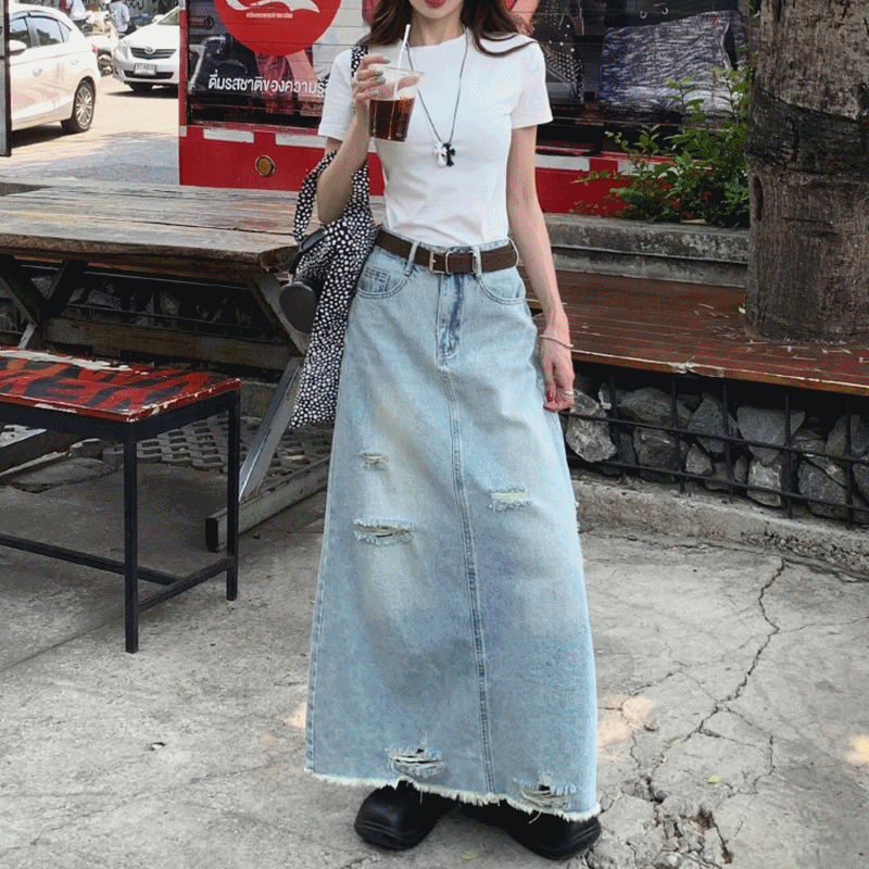 [여름롱스커트/💙슈퍼롱기장💙] 여름신상 데님스커트 데님롱스커트 A라인 다리살제거 몸매보정 유니크 데일리룩 데이트룩 꾸안꾸룩 개강룩 대미지 와이드 롱 스커트
