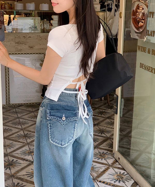 우트 뒷 트임 리본 크롭 반팔 티셔츠 (4color)