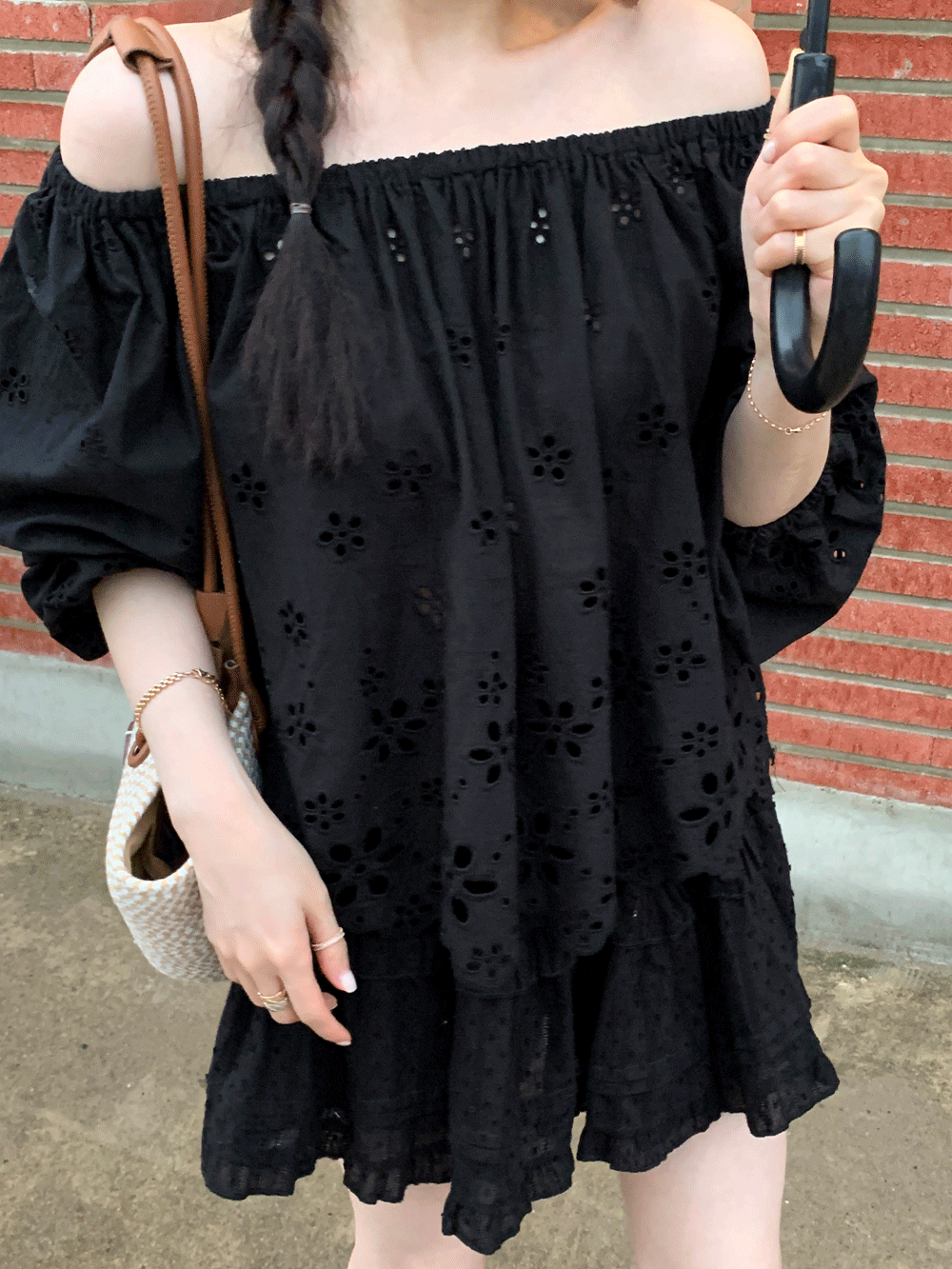 하프 아일렛 펀칭 투웨이 오픈숄더 블라우스 살안타템
