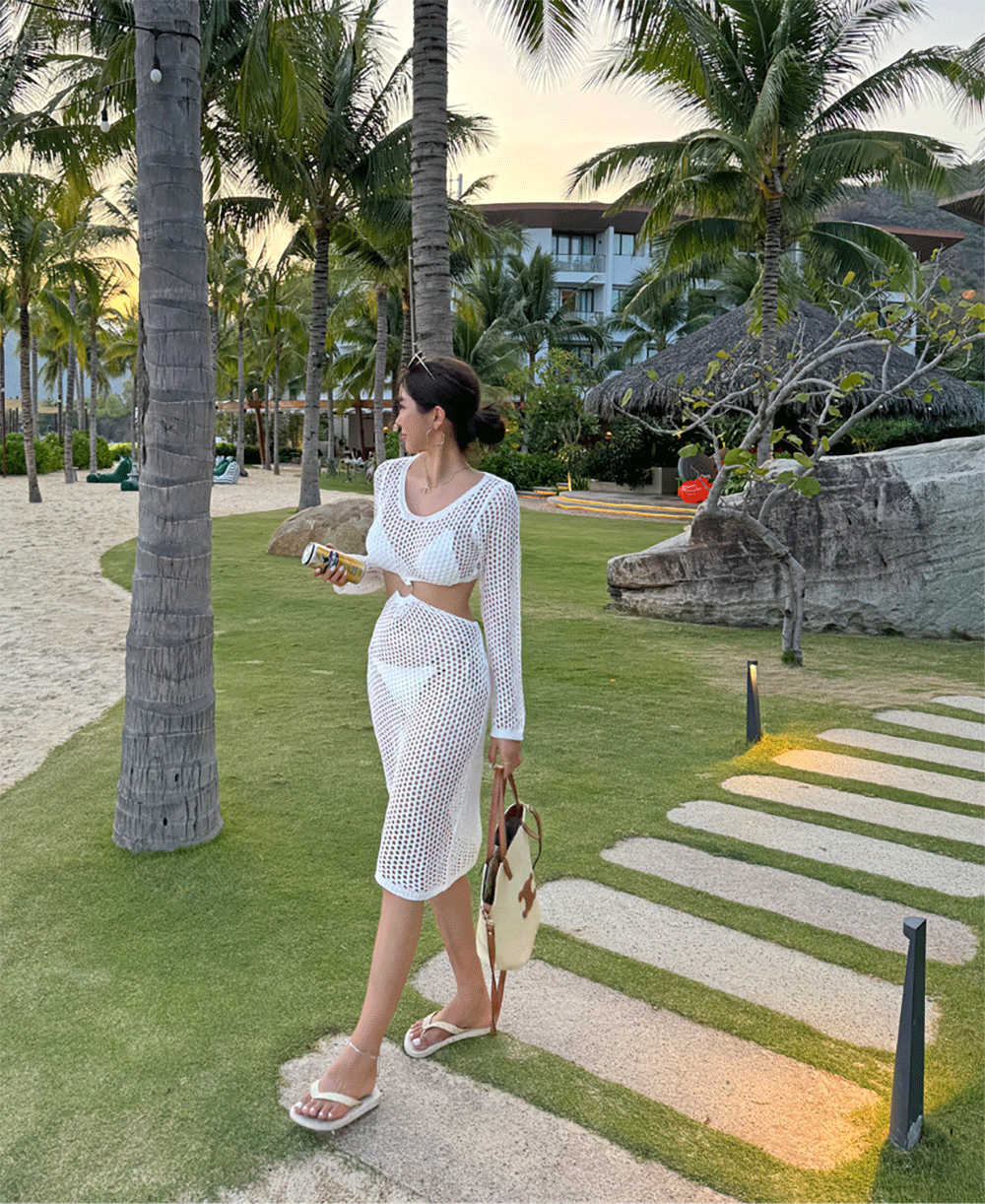 (커버업/휴양지🌴) 에런 시스루 그물 비치 롱 니트 원피스(2color)
