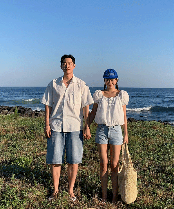 [여행룩/휴양지룩] 글로우닝 여름 반팔 셔츠 블라우스 데님 버뮤다 숏 팬츠 커플룩 시밀러룩