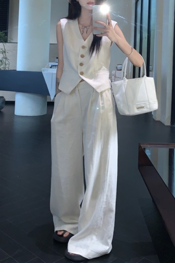 set 베리 민소매 브이넥 정장 조끼 와이드팬츠 투피스 세트