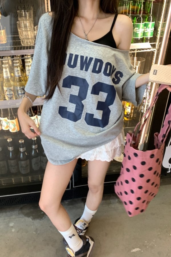 도디 33 프린팅 오프숄더 반팔 오버핏 티셔츠
