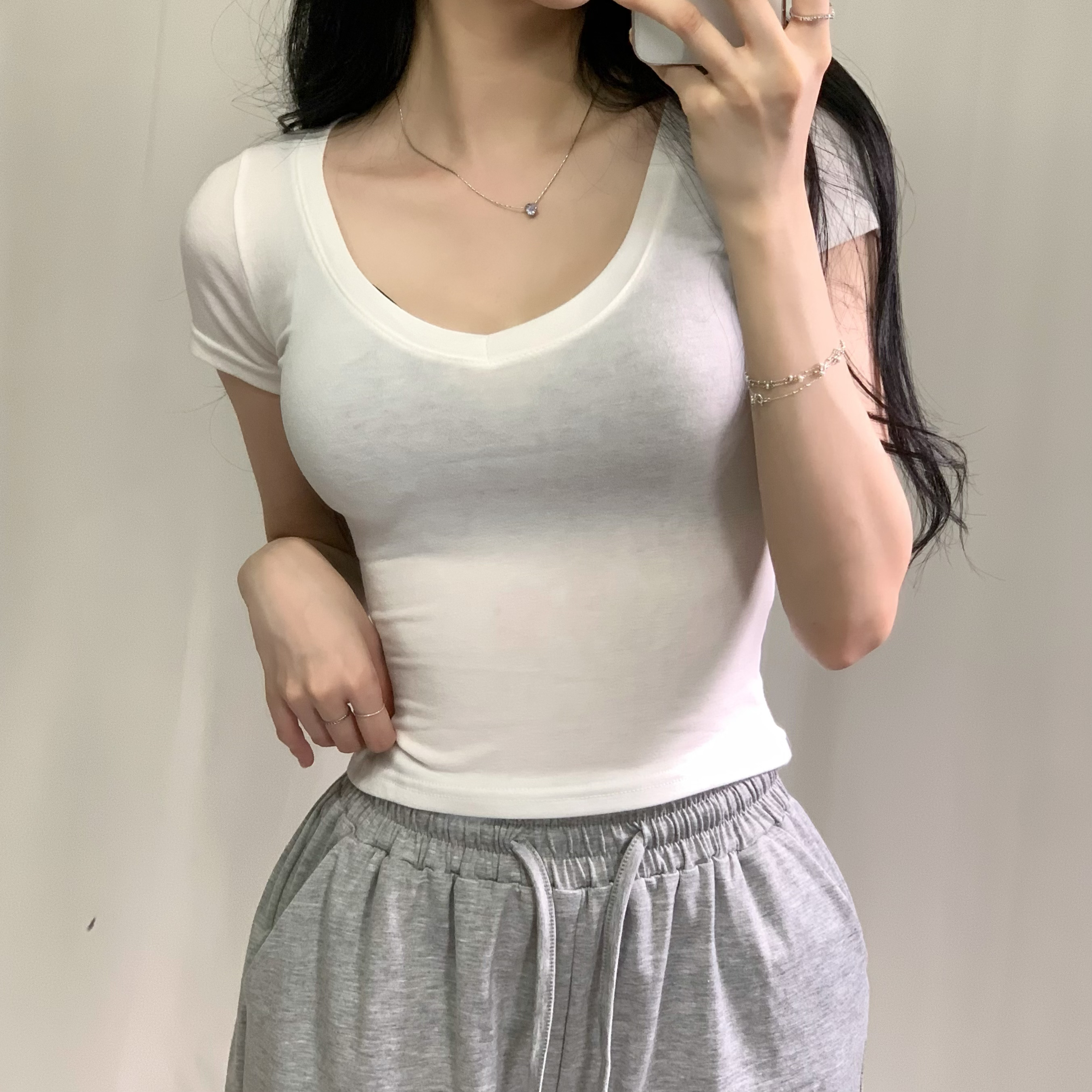 허리잘록 딥 브이넥 크롭 반팔티 (4color)