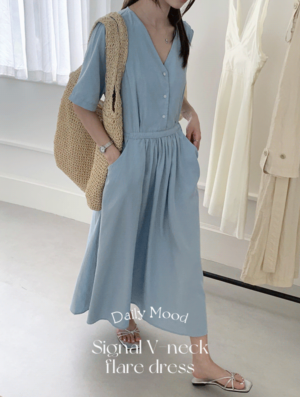[하객룩💖 ] 시그널 브이넥 플레어 원피스 OPS1055여름 반팔 롱 루즈핏 오버핏 A라인 하객룩 공항룩 여행 휴가룩 휴양지룩
