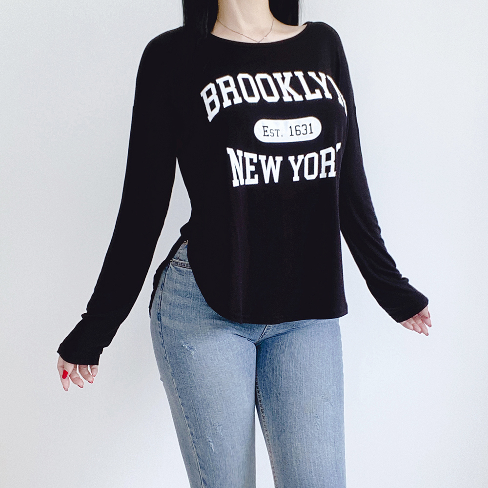 [장마룩☔스카룩📖커버업] 브루클린 가오리 긴소매티 2color 화이트 블랙 영문 레터링 나염 프린팅 뉴욕 루즈핏 살안타템 자외선차단 에어컨차단 독서실룩 야구장룩 바캉스룩 워터파크