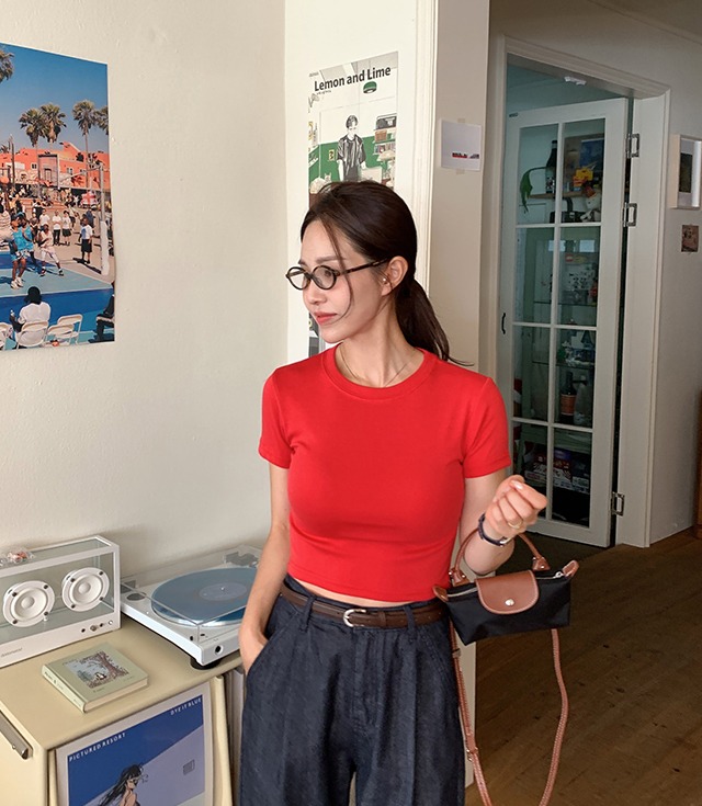 [1+1/두장가격/10컬러]로히 크롭 반팔티셔츠(10color) [숏 라운드넥 반소매 슬림핏 여리 이너 무지 레이어드 딱붙는]