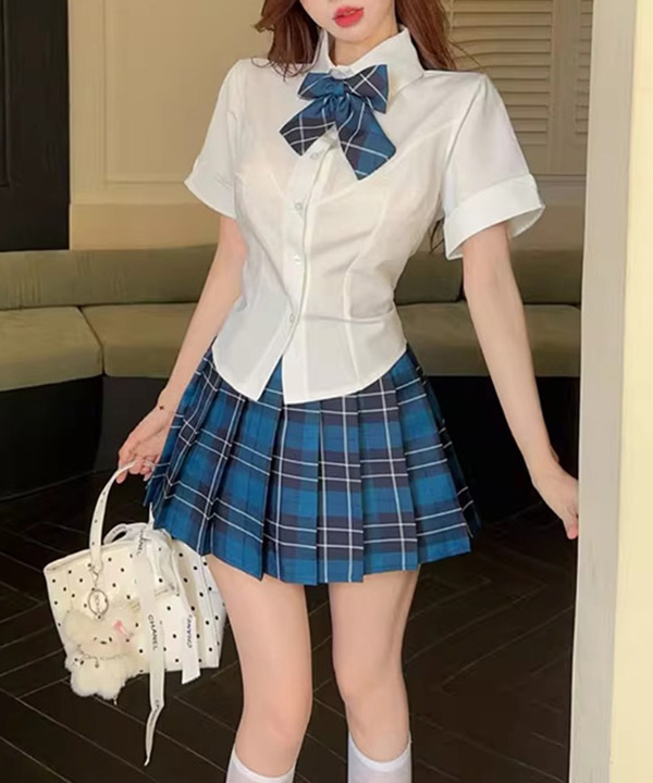비너 체크체크 러블리 스쿨룩 여름 반소매 플리츠 스커트 코디세트