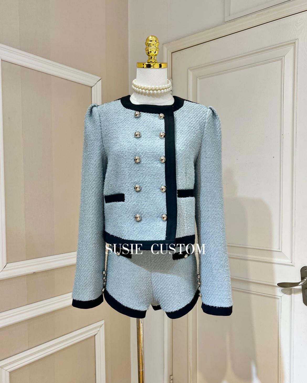 트위드셋업 하늘색자켓 반바지 투피스 여성정장 코디세트 하객룩 키작녀