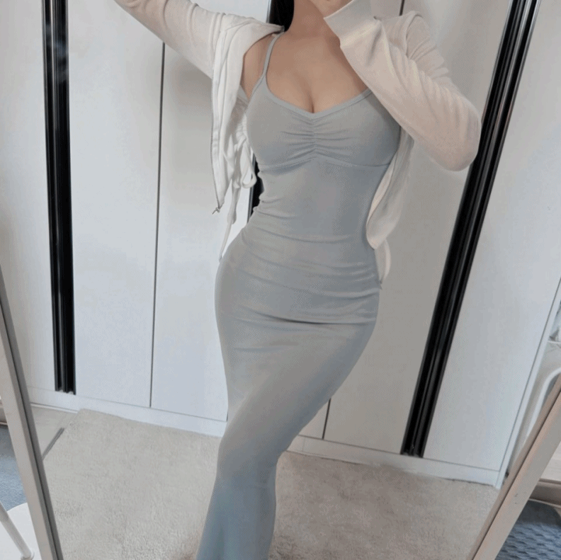 [🔥콜라병핏🔥/동탄미시룩] 허니 가슴 셔링 하트넥 브이넥 트임 슬림 나시 롱 원피스