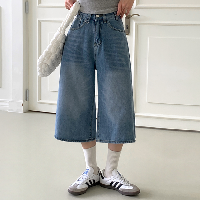 [핏보장템/힙한핏!] 샤이론 캣브러쉬 워싱 D버클 맥시 와이드 하프 벌룬 버뮤다 데님팬츠 7부,8부 청 반바지