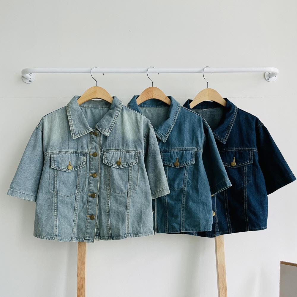 여름 데님 크롭자켓 여성 카라 포켓 반팔 청자켓 셔츠