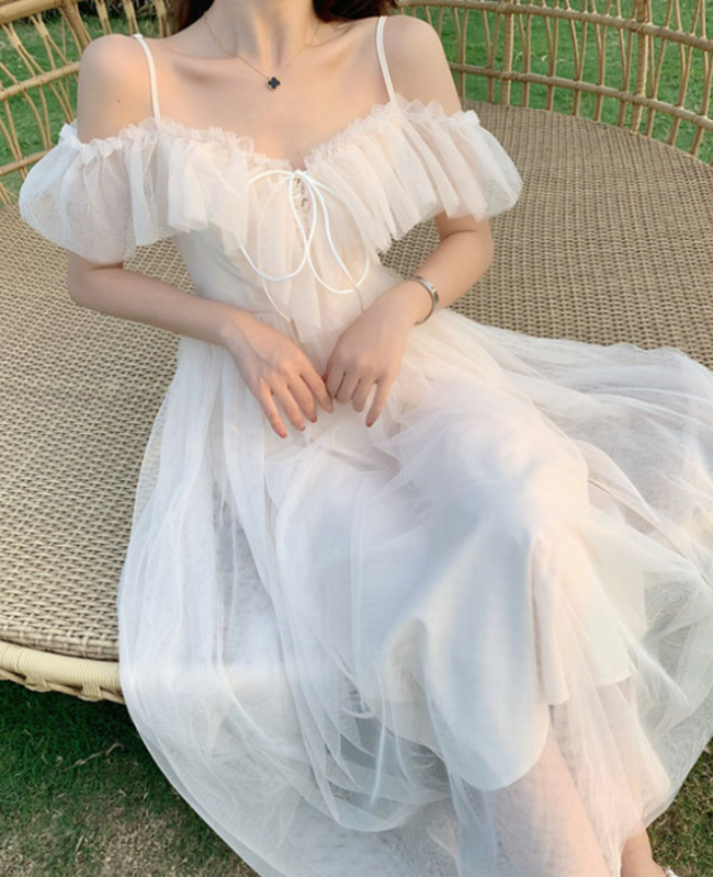 쉬폰 오프숄더 미시걸 셀프웨딩 롱 원피스