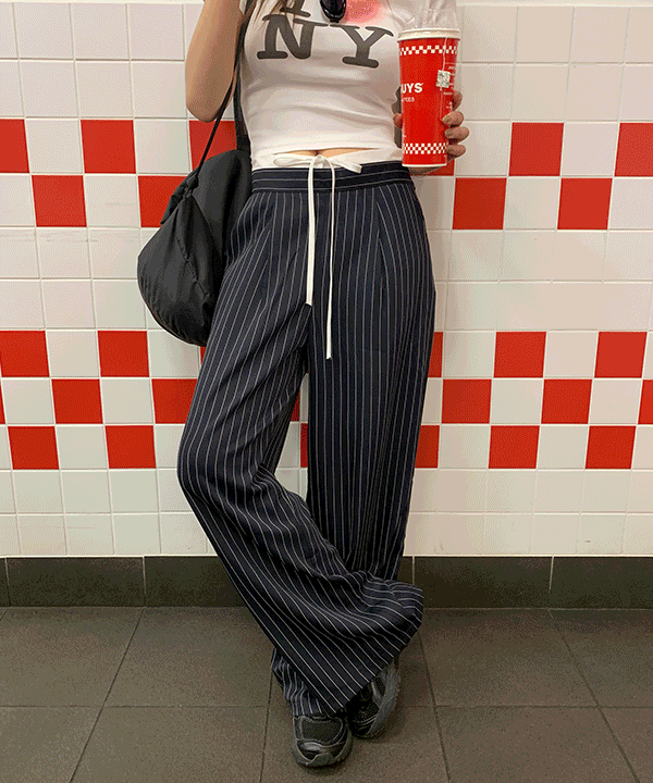 🎬 모니크 배색 스트링 스트라이프 핀턱 와이드 슬랙스 -2color