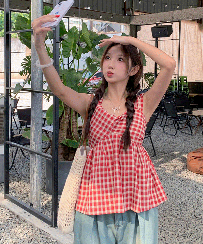 [클리어런스🛒] 민즈 체크 나시 블라우스