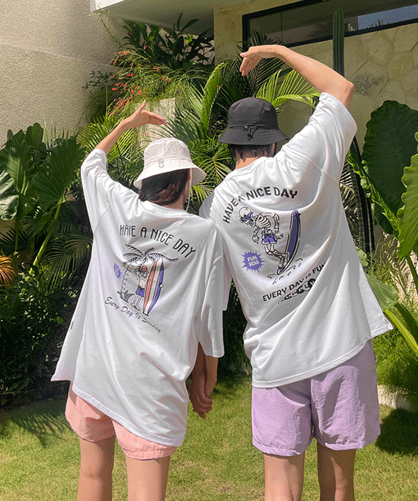 [2장세트]서핑 반팔 티셔츠 허니문 시밀러 커플룩[여름/남자/남녀공용/화이트/루즈핏/박스/면/라운드/바캉스/휴양지/데일리] TS20168F