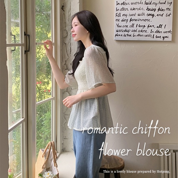 [수채화나염/하객룩💚][MADE] 케오 스모크밴딩 쉬폰 플라워 블라우스(44~100) (빅사이즈-데이트룩-쉬폰블라우스-나염블라우스-체형커버-윙소매-데이트룩-여름블라우스)