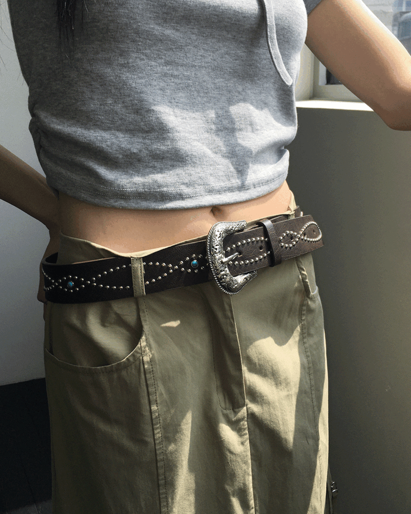 보츤 웨스턴 큐빅 원석 스터드 와이드 레더 벨트