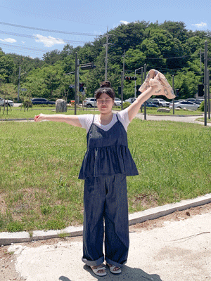 [55-120]빅사이즈 스모어 데님 브이넥 나시 프릴 뷔스티에 밴딩 포켓 스트레이트 와이드 롱 팬츠 셋업