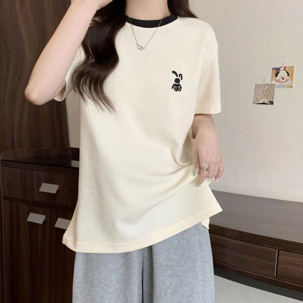 여자 토끼 자수 배색 라운드넥 반팔 티셔츠 여름 상의