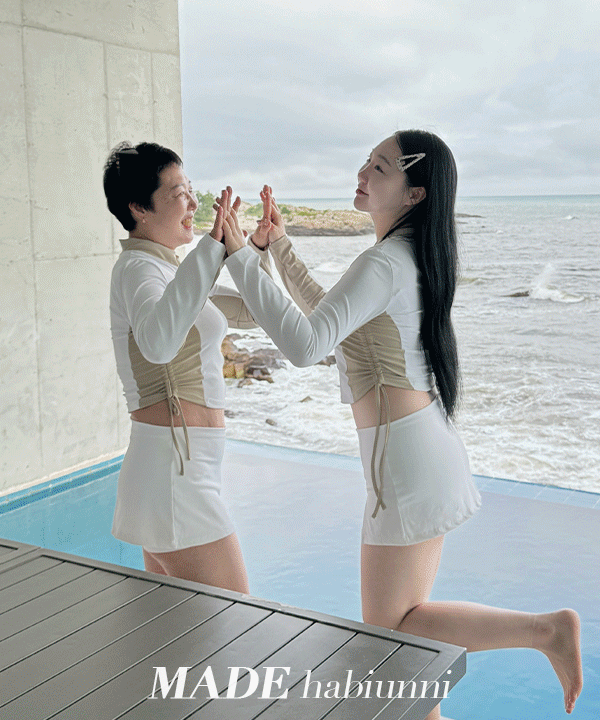 MADE #12436 허리잘록! 배색 반목 셔링 수영복 애슬레저 크롭 래쉬가드 집업 : S~L