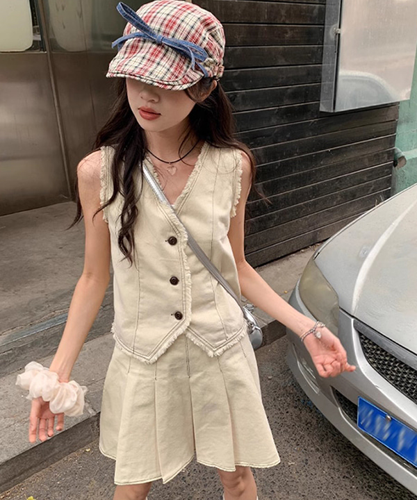 무료배송 [코디세트 베스트+스커트] 크림워싱 코튼 투피스룩