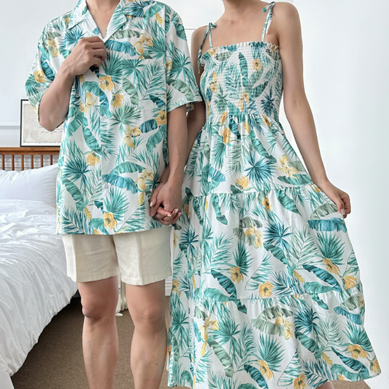 여자 남자 커플 비치웨어 롱 원피스 하와이안 셔츠 비치 해외 여행 휴가 비치룩