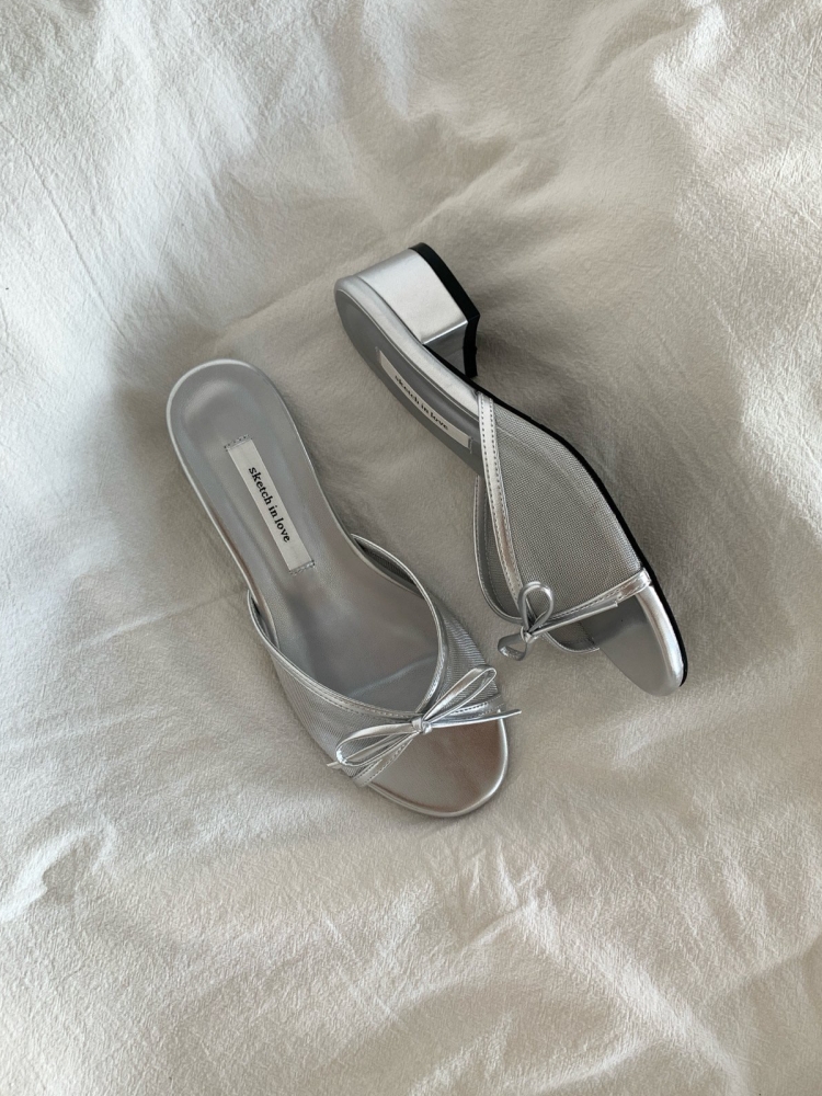 아카루 메쉬 망사 시스루 리본 라운드 토오픈 뮬 슬리퍼 3cm