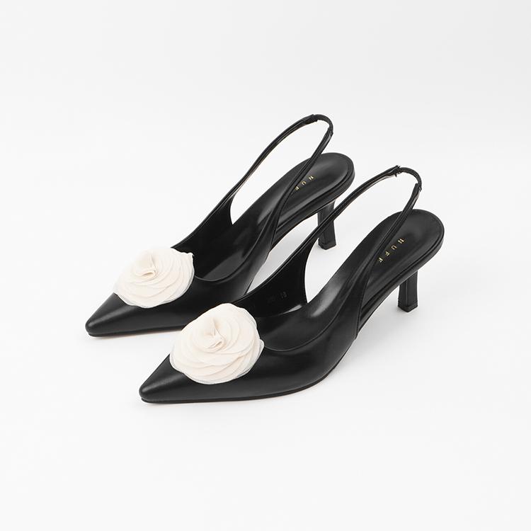 여성 슬링백힐 7cm 슬링백 구두 코사지 스틸레토 뒷밴딩 블랙