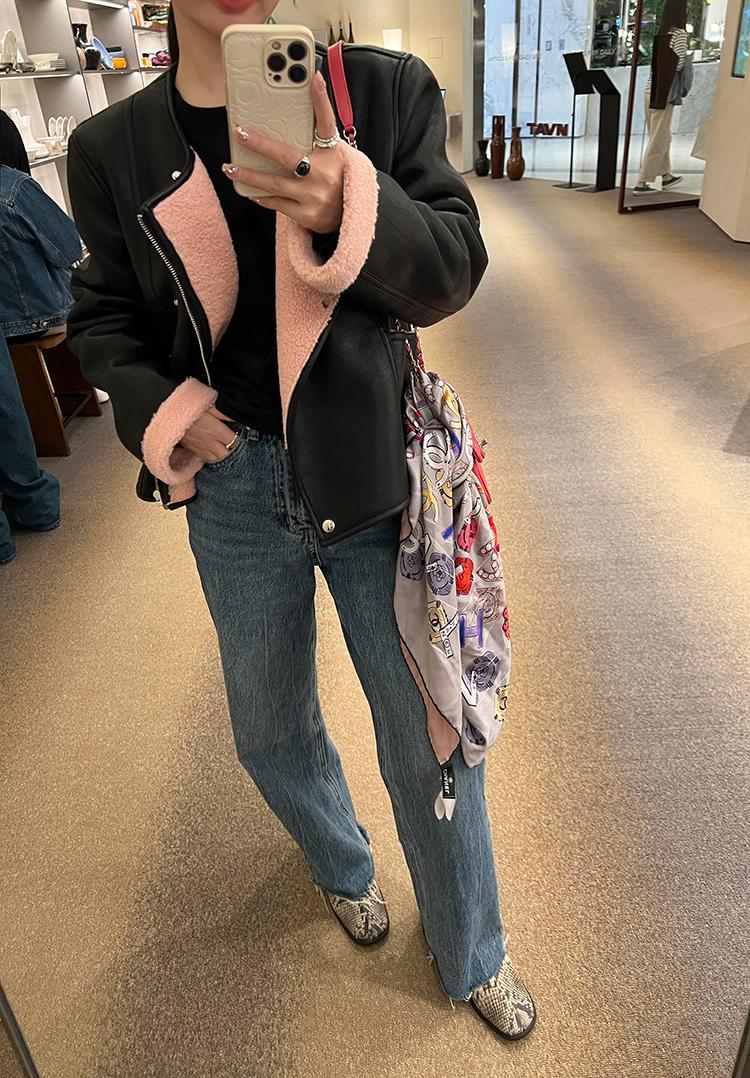 무스탕 리버시블 가죽자켓 배색 핑크 하프코트 겨울 미시룩