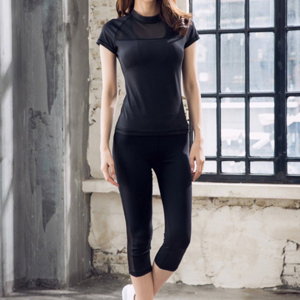 여성 시스루 포인트 반팔 8부 하의 운동 레깅스 세트