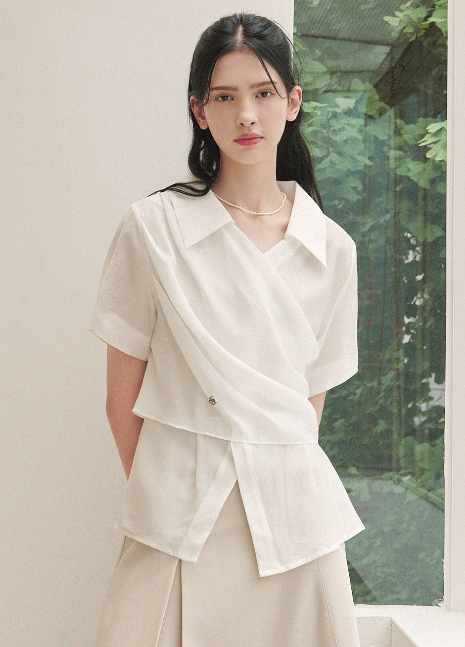 [44-120] Florescence Flat-Collar Wrap Blouse 플로레센스 플랫카라 랩 블라우스 (여름-데일리룩-데이트룩-출근룩-하객룩-격식룩-카라블라우스-오픈카라-페미닌-러블리-랩-빅사이즈-자체제작)