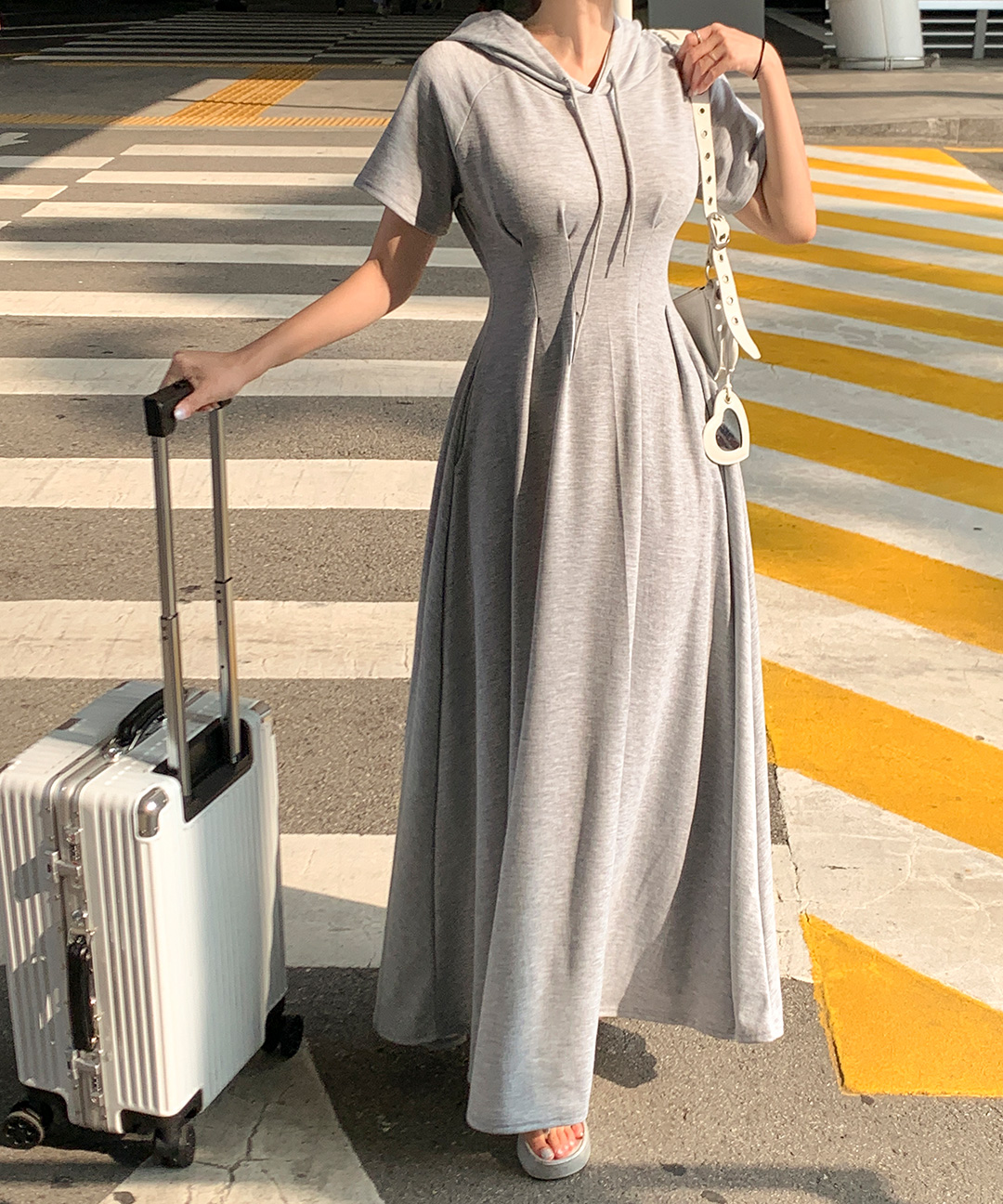 로헨느 꾸안꾸 후드 핀턱 반팔 플레어 롱 원피스