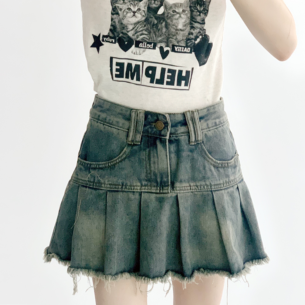[속바지안감] 미니츄 데미지 워싱 주름 데님 미니스커트 빈티지 청치마