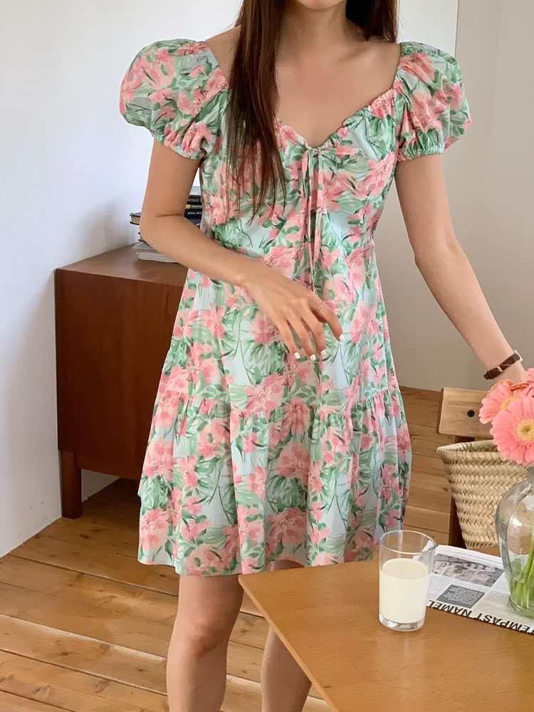 2color 르반 플라워 나염 프릴 셔링 스모크 밴딩 휴양지 원피스
