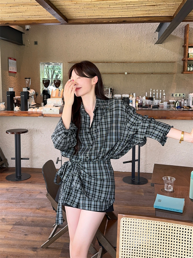 (코디세트)체크 패턴 카라 버튼 루즈핏 긴팔 셔츠 남방+레이스업 언밸 묶음 스커트 세트 LY323587