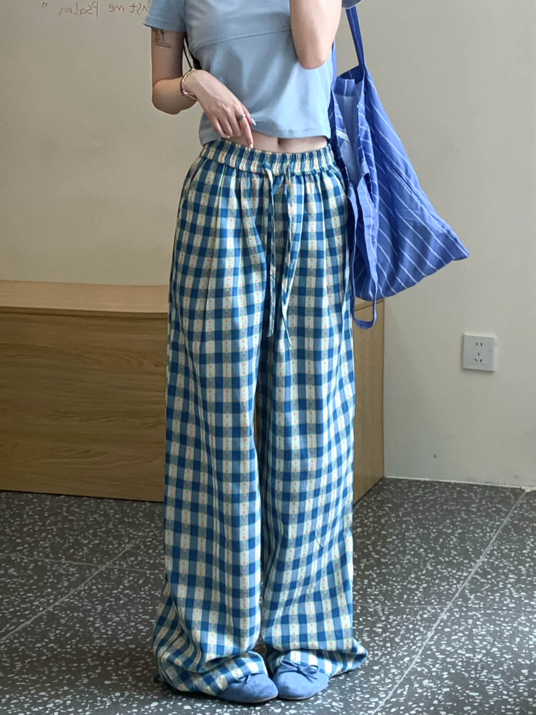 플라워 체크 프린팅 캐주얼 밴딩 와이드 팬츠 LY323407
