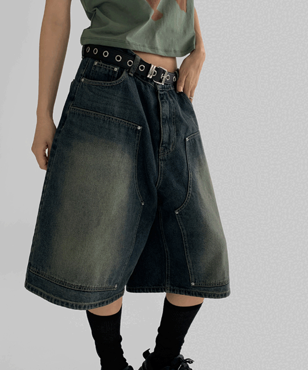 [UNISEX] 빈티지샵 옐로워싱 더블니 버뮤다데님