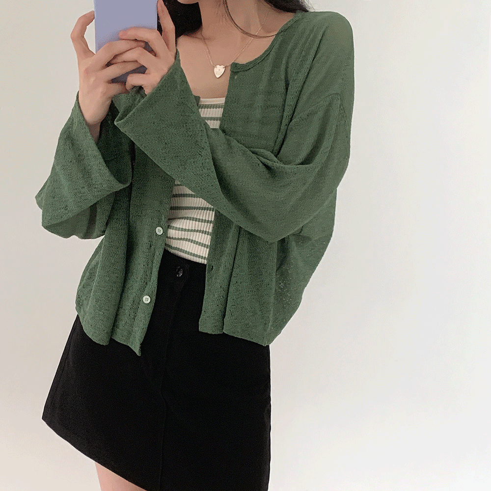 [살안타템/장마템!] 손등 덮는 여리함~, 여름 루즈핏 시스루 그물 버튼 단추 부클 니트 긴팔 가디건