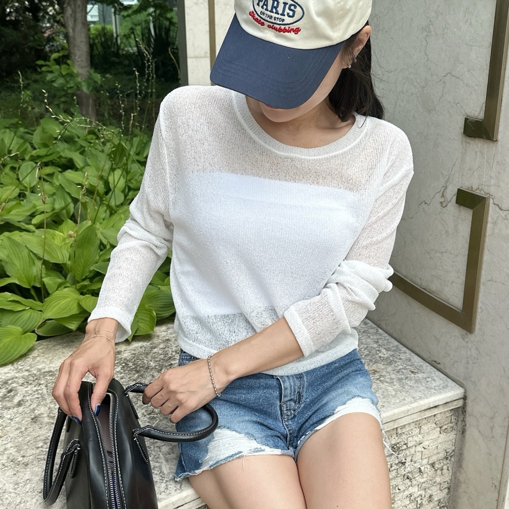린넨 시스루니트 흰티 그물 크롭 여름 여자 긴팔 니트 티 살안타템