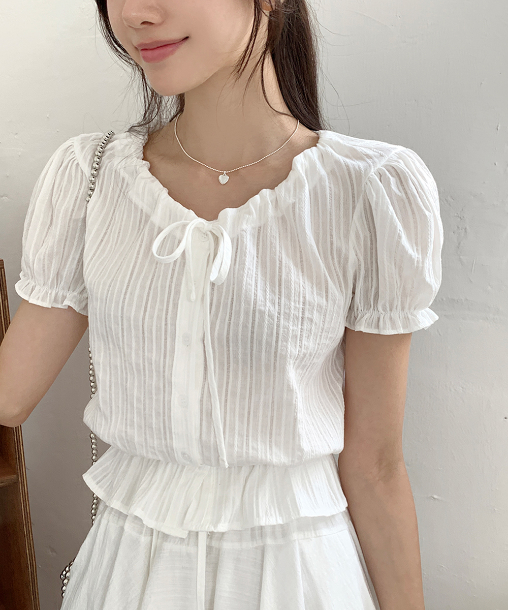 [러블리💛] 메자이 여름 코튼 리본 스트링 밴딩 퍼프 반팔 블라우스 하객룩 휴양지룩