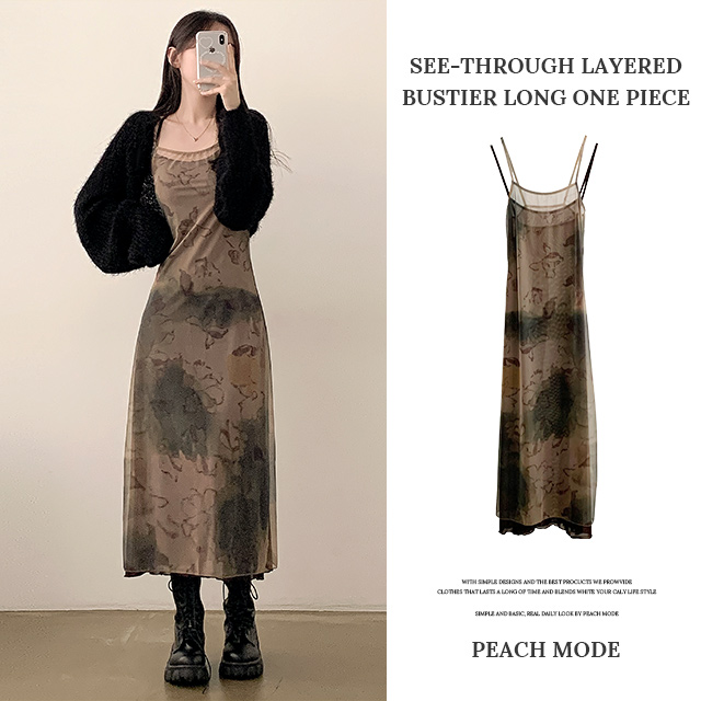 [나시+원피스/레이어드] 테로 시스루 물나염 망사 레이어드 뷔스티에 나시 롱 원피스 세트 (1color)