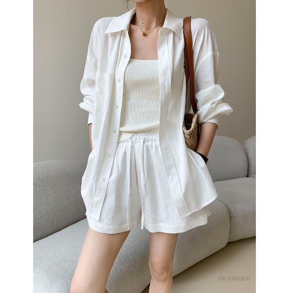 흰셔츠 와이드 반바지 팬츠 코디세트 얇은 루즈핏블라우스 밴딩 츄리닝