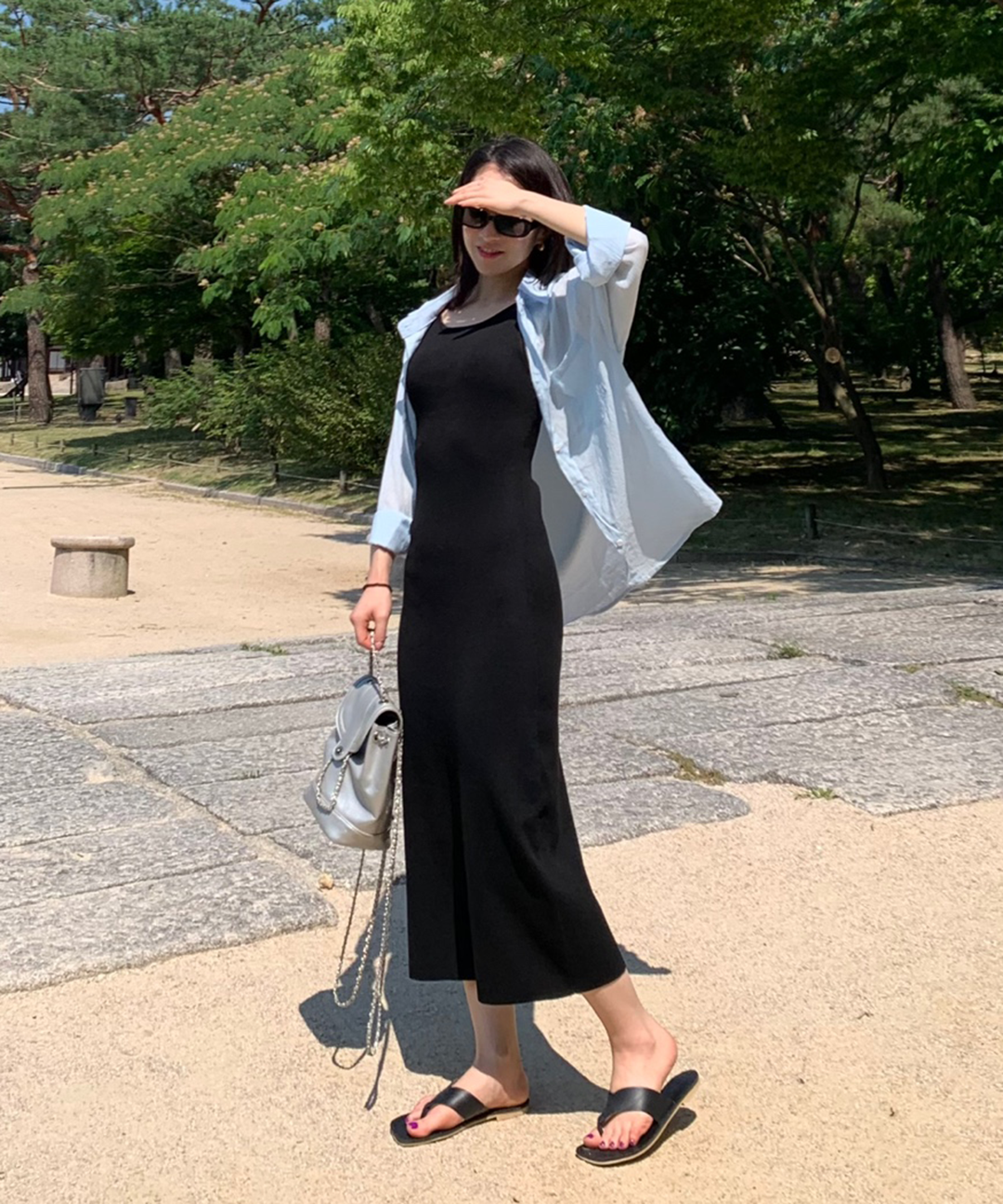 보트넥 민소매 니트 롱원피스 입술넥 끈조절 슬림핏 나시 휴양지룩