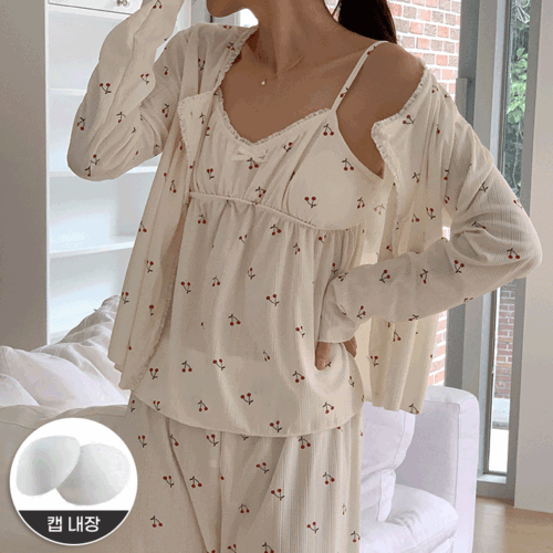 [내장패드/3Pset/색상추가!] 로미 가디건+나시 파자마 상하세트 여성 여름 봄 민소매 셋업 체리 잠옷 홈웨어 리본 프릴 레이스 캡내장 캡나시 no.2091